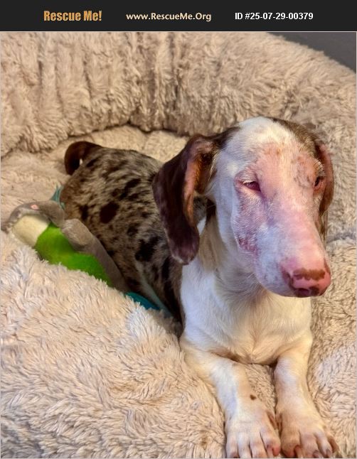 Hi I'm Marlouse! I'm a beautiful dapple doxie estimated at around 8 months old and 8.5 lbs as of the end of July. I'm a very sweet puppy despite the challenges of missing an eye. It doesn't matter to me and now I just need to find a forever family that it doesn't matter to either. It seems I spend a lot of time in a crate during my short life so learning from another well-balanced, playful dog would be really great for me. My $450 adoption fee includes vet check, up to date shots, deworming, microchip and spay. If you are interested in adopting me, please complete a free non-binding application at www.gofar.dog. If you encounter issues with our website, please email [email protected].