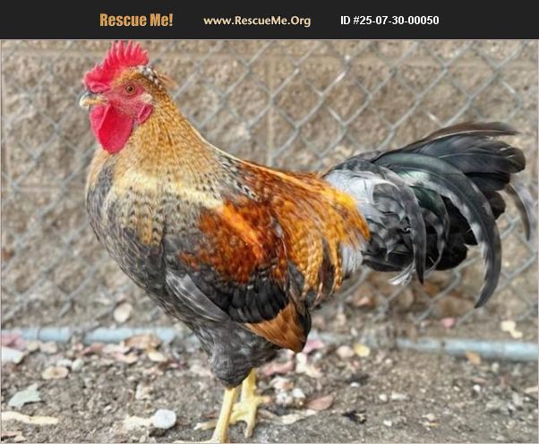 Located At: Moreno Valley Animal Shelter Description: I am described as male, red Leghorn. Age: My age is unknown. More Info: I have been at the shelter since Jul 16, 2025 and I am available for adoption now! Adoption hours: Tuesday - Friday 10:00am - 5:00 pm | Saturday 10:30am - 3:00 pm.