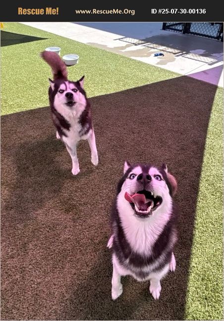 Pringle and Baron are a bonded pair of Siberian Huskies. They were purchased from a breeder at 8 weeks old and were with the same owner until recently when she surrendered them to us. They are currently 4 years old. They are very small huskies, each one weighs approximately 40 lbs. They are beautiful and fun and sweet and they are very affectionate. Both are awesome huskies. They are fine with other dogs but cats are a no go. They are good with kids. Both are potty trained and crate trained, 100% vetted and healthy. They cannot be separated and we will not consider it. Pringle is devoted to Baron and it would break his heart and spirit. The adoption fee is $500 for both dogs.
