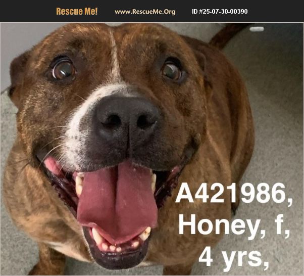 FREE ADOPTIONS THROUGH AUG 8! *55 pounds *owner surrender for reasons unknown to us. Previous owner shared no information about Honey with us. *already spayed *heartworm negative *patiently waiting and watching for visitors to stop and greet me *easy to leash and walk *curious about my surroundings *eager for treats - I'll dance!! *loves gentle rubs on her back and butt *located at Cumberland County Animal Services in Fayetteville, NC, 910 321-6852 *come visit me!! M-F, 11-5:30 and Saturday 1-5 *I am a sweet, chill girl who wants a second chance to experience love. Transport may be available.