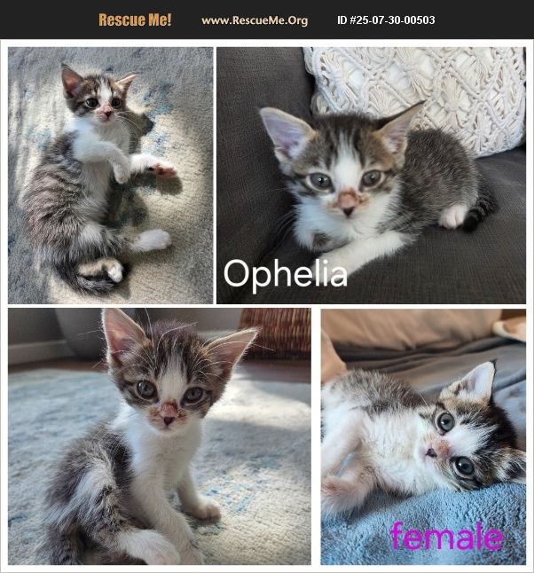 Looking for a tiny companion with a huge heart? Meet Ophelia, the calmest little cuddle bug you'll ever meet. With a gentle soul and a love for snuggling, she's the kind of kitten who prefers your lap to just about anywhere else. Soft, serene, and oh-so-sweet, Ophelia is the perfect match for anyone seeking a quiet best friend to curl up with. And don't let that little smudge on her nose fool you. It's not dirt, it's her signature style. Ophelia isn't messy, she's fashion-forward. Expected to stay on the petite side, she'll bring a delicate charm to any home. Whether you're watching TV, reading a book, or just sitting still, she'll be right there, purring softly and soaking in the love. She will be available for adoption on August 11, around 10 weeks old. She'll come vaccinated, boosted, spayed, and microchipped, all thanks to Kim's Kritters Rescue. This little lap queen is waiting for her forever home!