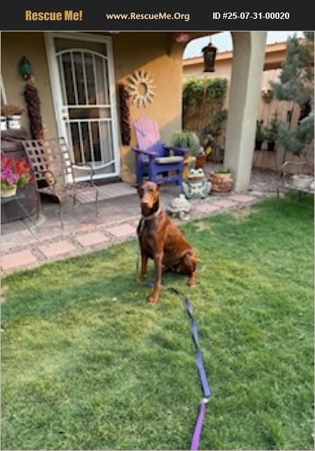 Girleen was found in May, emaciated with ribs and back bones protruding. When examined by a vet, she weighed 50 lbs. and believed to be approximately 2 years of age and appeared that she had had puppies. She is now at a healthy weight and spayed. The good Samaritan who saved her is 82 years old and scheduled for total right hip surgery in late August. Even though she loves Girleen, she feels this sweet Dobie is too big for her to handle and deserves a younger, active home where she can grow, have a big yard and be treated with love and care. Girleen is affectionate and eager to please. She is housebroken, crate trained and learning basic obedience commands. When found, she was running with another dog. We do not know if she has been around children or cats. She does not like the sound of the outside water faucet. Please complete an application @ http://www.dobermanrescuenm.org. This beautiful girl needs you! A $300.00 adoption fee applies.
