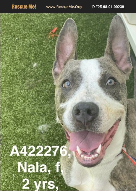FREE ADOPTIONS THROUGH AUG 8! * weighs 46 pounds * heartworm test is pending * she is not spayed but will be upon adoption if not before * she was brought in as a stray * greets at her door with tail wags, wiggles, and doggy smiles * sweet, happy, friendly and social * easy to leash with good leash manners * calm and quiet in and out of her kennel * smart - knows the sit and stay commands * gentle, loving, and affectionate * appears non reactive to other dogs - paid no mind to the dogs outside and when passing by their kennels, of course meet and greets are always recommended! * fun fact: you won't be able to resist Nala with her adorable, expressive ears and her big beautiful smile Nala is a sweet and happy girl. She loves to see visitors and she wants to be near you soaking up your love and attention. She is an all around wonderful dog who will surely steal your heart if you let her! Our shelter is full, please come take this baby home! Transport help may be available.