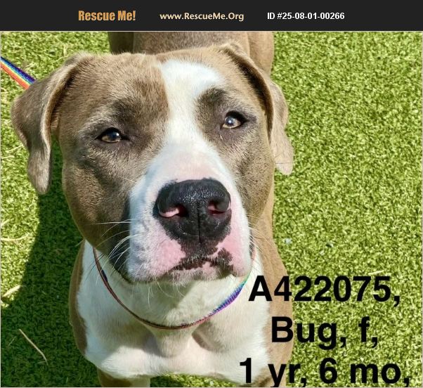 FREE ADOPTIONS THROUGH AUG 8! * weighs 47 pounds * heartworm negative * not yet spayed but she will be upon adoption if not before * owner surrender as her previous owner is homeless * appears dog friendly - she came in with other dogs. I saw no reaction to dogs outside; as always we recommend meet and greets with your dog(s) * No cats as she will chase them * may do best in a home with older children as young children startle her easily * housebroken * greets at door with tail wags - somewhat shy but warms up quick * calm and quiet in and outside of her kennel * she can be somewhat timid with men but once she trusts you, she wants to love * good on leash - she explored the yard a little but preferred to stay close by my side getting pets and attention * smart - knows the sit command * wants to please and listens well * loves a good back scratch and leans in close for them * very gentle treat taker Bug is a beautiful and sweet girl who is a little sad and confused to be here as she is missing home. She was a little shy at first but we quickly became friends. She shows off her gentle and loving side once she trusts you. She loves a good treat and welcomes any and all the pets you are willing to give her. Bug would love to have a home quickly. We don't know what her past but we hope her future will be filled with love and kindness. Transport help may be available.