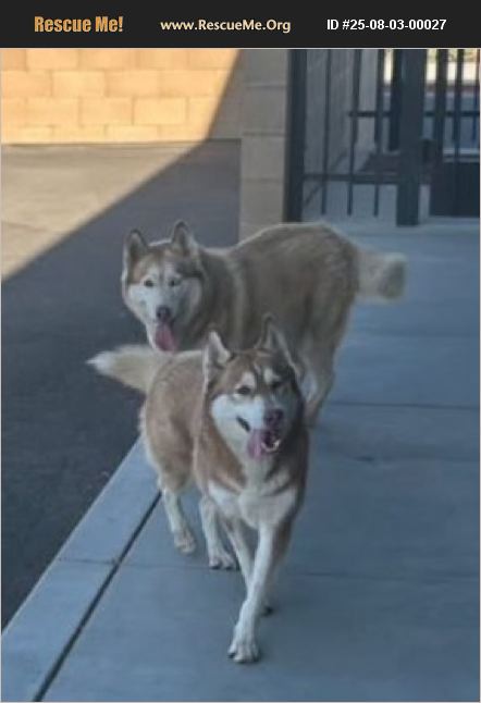Two female Siberian Huskies. They are sisters and must be adopted together. They appear to be healthy. Apointment for vet evaluation is upcoming. Very friendly.