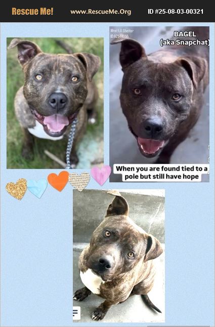 Videos: https://www.facebook.com/reel/1172491631107617?fs=e&mibextid=wwXIfr&fs=e https://fb.watch/BfN5C-8jFf/?mibextid=wwXIfr&fs=e https://fb.watch/BfMnarbtG0/?mibextid=wwXIfr&fs=e BAGEL (aka Snapchat) ID #A2148655 Bagel was found tied to a pole alongside another dog named Google, who has since been adopted. While the person who discovered them claimed that one of the dogs may have bitten someone, this was never confirmed, nor was it determined which dog it was. This handsome boy is adored by many including the animal control officer who picked him off the street. Bagel has been in the shelter since October 2024, which is way too long for a sweet boy like him!! Please open your heart and home and get him out of this awful place. *Shelter hours: Tues -Fri 8-5 Sat & Sun 11-5