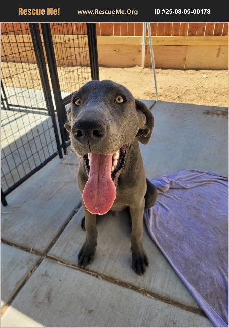 www.socalweimrescue.org/adopt This totally designer dog has been named DIOR after his good looks. Dior is a blue boy estimated at around 10-12 months old. This poor guys showed up at the doorstep of a family who took him in to try to find his owner. Nobody ever came and they can't keep him because of multiple dogs already in the household. Dior has had to stay outside because of the other dogs but he has come in many times without accidents. That's not to say he is reliably house trained but he is not know to be a 'marker'. He has a natural tail and beautiful blue coat. He is super sweet and loves to play ball. He is just coming in to us in a foster in the North LA County area near Lancaster. Dior has not been great on leash but we'll be working on this. He freezes with a leash on his collar. He loves to be touching you, he will lean on you and nibble on you. He loves to lick but mainly licks your hands/arms. He will tap you with his paw to ask for pets. He LOVES to meet new people and seems very social and friendly. He's been living with and around small dogs and interacts with active curiosity and loves to run. Dior is just a baby and is so eager to please he should learn your routine really fast. Get your application submitted and if you've been waiting for a young male this boy is stunning!
