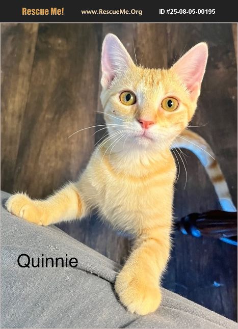 Meet Quinnie! Quinnie and her 2 siblings found themselves at an overcrowded shelter. Luckily we were able to rescue them and they landed in a wonderful foster home. Quinnie is a gorgeous orange tabby female kitten. She has the most beautiful markings. Quinnie is 6 months old as of October 11th. From Quinnie's foster mom: Quinnie is such a sweet girl, she's a lil purr engine. She likes high places. Plays well with others. Keeps me smiling. She is well socialized and having a blast with her siblings and several other kittens at her foster home. Quinnie is spayed, up to date on shots, microchipped and ready to find her family! All cats and kittens will only be adopted out as an INDOOR cats where they will be safest! We don't want anything bad to happen to these precious babies! Quinnie is in New England and ready for for adoption. The adoption donation is $275 which includes vetting and a microchip, plus covers the costs for transport north. If you are interested in opening your home to this wonderful kitty (or 2) please visit our website at www.angelsamongusanimalrescue.org and fill out an application to adopt!