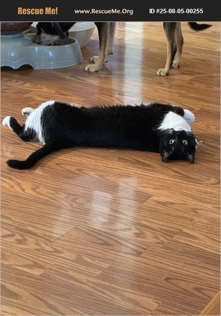 Sweet tuxedo kitty, she gets along with 2 male cats overall, and 1 female dog. She does not like big dogs or male dogs. She does well with adults but not great with little kids.
