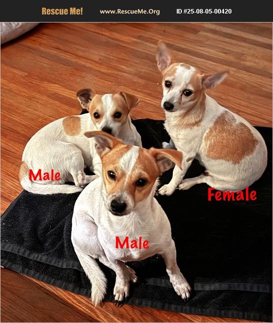 These 3 kids need special and dedicated foster or foster to adopt homes, separately. They are siblings, approximately 1 yr old, chihuahua/JRT mixes (9lbs). They were trapped as strays and no one has claimed them. They are not 'new people' socialized. They are good in a home, enjoy a fenced back yard and are treat/food motivated. They do not try to bite, but will not allow significant touching just yet. They will take food or treats from your hand. They do well with other dogs and cats. There are 2 males and 1 female and are fully vetted. We need 3 people willing to patiently work with them to show them what being a loved pet is all about. Special adoption fee to the right home. If you are interested in one of these pups please complete our application. Calling all you dog whisperers! These 3 kids need special and dedicated foster or foster to adopt homes, separately. They are siblings, approximately 1 yr old, chihuahua/JRT mixes (9lbs). They were trapped as strays and no one has claimed them. They are not 'new people' socialized. They are good in a home, enjoy a fenced back yard and are treat/food motivated. They do not try to bite, but will not allow significant touching just yet. They will take food or treats from your hand. They do well with other dogs and cats. There are 2 males and 1 female and are fully vetted. We need 3 people willing to patiently work with them to show them what being a loved pet is all about. Special adoption fee to the right home. If you are interested in one of these pups please complete our application. https://app.ontask.io/w/rpof/adopt
