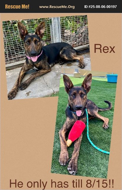 Rex is scheduled to be euthanized on 8/16!! Must be saved by 8/15 end of day!!! REX, A2209274, MALE, BLACK BELGIAN MALINOIS MIX Age: 1 YEAR 1 MONTH, 80.60 lbs. videos: https://youtu.be/uGMecDPilg8?si=cy_qen1qElVp_T0u https://youtu.be/AndEwJRsjnY?si=FZ7KUZlmUAI1uQxh https://youtu.be/ynyGTaGrBXA?si=k-rEQUImc-GjC6rP EUTH Listed!!!�%A0�%A0REX (#A2209274).�%A0�%A0Must exit EOD 8/15! Rex has a heart as big as his ears! He is an easy-going, loving, playful, friendly & medium energy Dutch Shepherd mix who is highly intelligent & eager to please. Rex is affectionate & trusting w people, giving kisses & rolling over for belly rubs. Rex is social w dogs (gentle/dainty play style) & has attended playgroup 5 days/wk since intake. Rex knows sit & down command, treat motivated w gentle mouth & excellent attention. Rex likes toys, but prefers just hanging out w people. Rex would make an excellent jogging, hiking or adventure buddy!�%A0�%A0Rex also seems house broken, prefers potty outside kennel. Given his age, size & breed, recommend no small children & a dog owner who understands the requirements of such a smart & industrious dog, capable of learning anything!�%A0�%A0Reason for euth-list, got jumpy/mouthy 1x with volunteer (did not break skin). Rex, #A2209274 1yo intact male, 80lbs Stray, left at site Intake 7/14/25 Harbor shelter 957 N. Gaffey Street San Pedro, CA 90731 310-548-2632 (tel:310-548-2632) Closed Mondays Tuesday-Friday 8-5p Sat & Sun 11-5p For further info, please contact Lifesaving liaison: mailto:[email protected] mailto:[email protected] 310-548-2632 (tel:310-548-2632) 213-605-4473 (tel:213-605-4473) Supervisor [email protected]