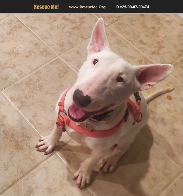 Rescued English Bull Terrier. Believed to be spayed. I took her into my home after she was dumped, and running the streets. She has learned to get along with my other dog (she is very excited so it took a few days) but she cannot be with cats, which I also own. I have had her for about a month and had hoped she would get to learn to give them their space but she has not. She is potty trained and kennel trained. Can be vocal, as a lot of EBT. She is very sweet and loves attention. Just NO cats. I so hate to let her go. She has been to vet and is UTD on vaccines. Rehoming fee of $150