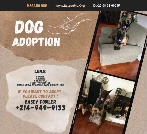 Luna is a 4-5 year old Belgian Malinois who was given up by her elderly owner who couldn't take care of her anymore. She loves people and wants to be friends with everybody. Luna likes snuggling and laying in a sunny patch of grass.