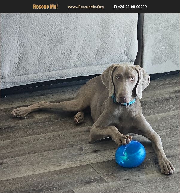 PENDING ADOPTION PLEASE submit a form of interest to www.socalweimrescue.or/pages/adopt The SKYY is the limit with this 8 month old beauty. This super friendly social ACTIVE outgoing wonderful girl is a purebred Weim. She is like all active Weimaraners.......into most things but a quick learner and eager to please. Skyy was adopted by a military family who never had a Weim before. OOPS! Their schedule kept them away from home long hours while Skyy's mind was like an inmate in prison...WHAT CAN I DO TO KEEP BUSY! She was crated and of course decided the bedding would be loads of fun to tear up and the 'jail' was meant to break out of. So her family would come home many hours later wondering why the crate was soiled, torn up, and an absolute mess! This resulted in several UTI'S. Her family was perplexed and took her to the vet to find out why she was having infections only to then have a reaction to the urine collecting procedure. Skyy came out of it with some knuckling in her hind paws. After several hours of recovery her legs returned to normal and all has been resolved with her legs and the UTI's. She then was kept in a small outside kennel run where she was free to do her business (hence no more UTI's) but she was still horribly bored with her mind reeling on things to keep her busy. She learned to escape the short white vinyl fence by jumping on the dog house and going into the forbidden Garden of Eden of the yard. So here we are...her family is finding that they do not spend enough time home with her so her puppy ways are not improving without any human interaction. Skyy is yearning for love, for activity, runs on the beach or just some cuddles on a couch. She is great with other dogs and lived with a labrador. The family expected a Weimaraner to be just as easy as a Lab and we all know otherwise! Skyy is housebroken and crate trained if not left for overly long hours. She has a docked tail. SKYY IS A PUPPY! She will need some work and weimaraner knowledge but is surely very willing to please. She is fostered in the San Diego area moving up to Riverside in a day or two. We will keep this updated. Come meet this devilish angel! She is not spayed due to age so will be adopted with a spay contract.