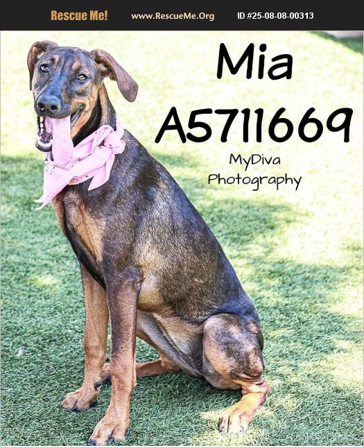 Mia is in a high kill shelter located in Castaic, California. Transportation information is available. Please save her before it's too late!!!! Video: https://fb.watch/BnvVHq9OMv/?mibextid=wwXIfr&fs=e Allow us to introduce you to Mia, a Doberman Pinscher mix with the regal bearing of a queen and the playful spirit of a puppy! Mia (A5711669) is a stunning one!! She is a 1 year old Doberman Pinscher with a striking black and brown brindle coat that defines elegance. Mia came to the care center when her owner no longer had time for her. Don't let her refined looks fool you, though! This girl is a total goofball at heart, with a personality as big as her paws. Mia is bursting with energy and would thrive in an active home. Think long hikes, playful games of fetch, and a family that can keep up with her boundless enthusiasm. This curious canine is always eager to know what's happening and won't miss a thing- she's a nosy Nellie who always wants to be involved! A true treat enthusiast, Mia is incredibly gentle when accepting snacks (she's a lady, after all!). She's also eager to please and will happily 'sit' for a yummy reward, though she gets a little *too* excited and might pull on the leash during walks (we call it the 'pogo dog' excitement dance!). Mia is smart, hilarious, and guaranteed to keep you laughing with her silly antics. Sadly, Mia's previous owners couldn't dedicate the time she deserves. But their loss is your gain! This smart, funny, and affectionate girl is ready to find her forever home. Are you ready for a lifetime of laughter and adventure with Mia?