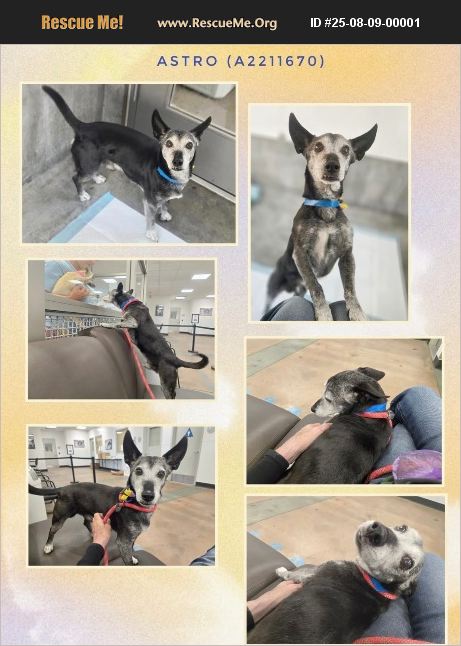 Senior cutie-patootie alert! ASTRO (#A2211670) is out of this world (at least his ears are). And he is also out of his home. ASTRO was found running on streets, and the Good Samaritan who caught him tried to find his family, to no avail. He was taken to the East Valley Animal Shelter in Van Nuys, CA, and sadly, no one has come forward to claim him. (At the shelter, it's noted that he could be a door dasher.) ASTRO is estimated to be 11 years old, yet he possesses the energy of a much younger dog. Regardless of his age, he's absolutely heavenly! He may seem a little shy at first, but it won't be long before he's cuddling up with you. And he does well sharing the room with other dogs. Head over to the shelter to meet ASTRO. Adopt him and he'll be a shining star!! East Valley Animal Shelter 14409 Vanowen St., Van Nuys, CA 91405 Open: Tues-Fri 8-5; Sat & Sun 11-5; Closed Mondays