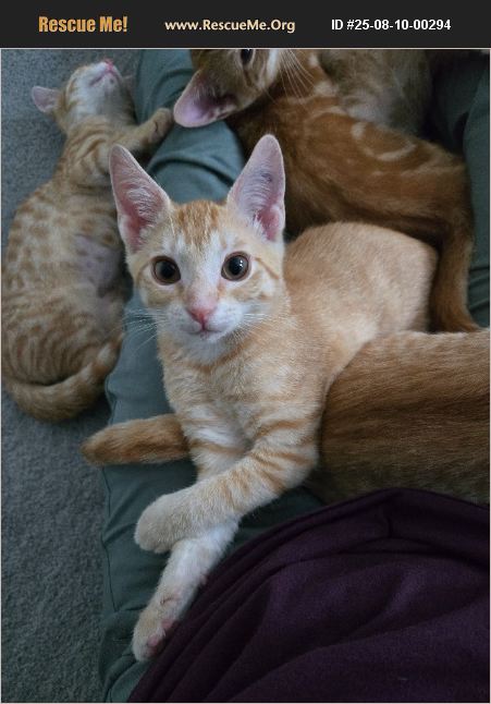 Hero and his siblings had a very rough start in life. They were taken from their mama too young and taken to the shelter, then they had lots of respiratory issues. But after 3 months at their foster mom's getting lots of food, love, snuggles, and care, Hero is now a very handsome and healthy boy. Hero is a snuggle bug. He loves to be held and loves to be in your lap. He is very active though, and chases and wrestles with his brothers. At his age and activity level, he will need to be adopted with another young male kitten (maybe one of his 3 brothers) unless his adopter already has a male kitten or young male cat at home. To meet Hero and other adoptable Purr Partners kitties at one of our weekend adoptathon events, 1) review our adoption policies at https://www.purrpartners.org/adopt/policies/ and 2) then apply to become a pre-approved adopter today at https://www.purrpartners.org/adopt/cats/