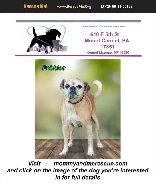 Please fill out an application here ) https://mommyandmerescue.com/adoption-application/ and give your vet clinic permission to speak with us. Spayed/Neutered, UTD on vaccines, Chipped Adoption fee 125 You must submit the application and be approved prior to meeting one of our dogs. Please add our EMAIL to your contacts! [email protected] Kennel License: NP 16320 Pebbles Pug mix Female 9 years old Weight: 16 pounds Pebbles came in as a stray. She is such a sweet, loving girl. She loves everyone she meets. She likes other dogs. She would do ok with older kids. She is house-trained and crate-trained. She is a laid-back little girl who would love to snuggle with you and stay by your side. She likes short walks and snoozing.