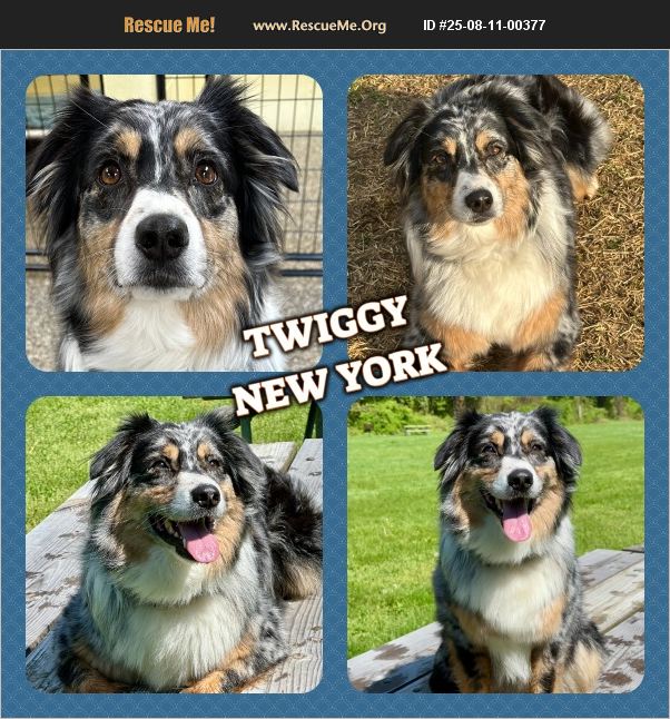 Meet Twiggy! This beautiful blue merle girl is not in the ARPH program; we are assisting the owner in finding a new home without other female dogs. She might be okay with the right male but would probably be best as an only. The opposite is true with humans though, Miss Twiggy prefers women. She is four years old and weighs in at around 42 pounds. She is spayed, up to date on vaccinations, crate trained and house trained. A fenced yard is preferred for her safety, but homes without one will be considered on an individual basis. Kids 12 and up would be okay, but she's unknown with cats. Twiggy is a whip smart, high energy, high drive Aussie that will need an experienced handler. She knows many commands and tricks and is easily trained. She loves going hiking and mountain biking with the adult family daughter. Her Aussie reserve makes her cautious and barky when meeting new people. But break out the treats, and she's there. She also loves toys. Twiggy is excellent in the car, at the vet's, and at the groomer's. Check out this clever girl's video!!https://www.youtube.com/shorts/ZNsz2SYoa4I?si=-Q6fela_KJebG_Nn In the right home, Twiggy will be an amazing companion and will form a strong bond with her people. If you think you have the time, energy, and experience to live with a real Aussie, Twiggy might be your girl. She is currently living near Putnam Valley, NY. If you are interested in adopting Twiggy, please submit an application from our website at www.aussierescue.org