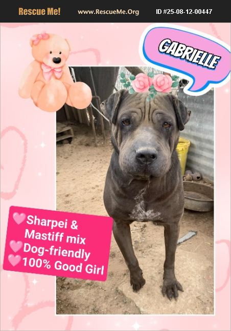 Gabrielle is a stunning 3-year-old Shar Pei/Mastiff mix. She is a gentle giant with a loyal heart and an impressive presence. Gabrielle gets along well with other dogs but she does not like cats. She is spayed, healthy, and fully up to date on her vaccinations. Gabrielle is currently with Just Paws Inc. in Odessa, Texas. Transportation must be arranged at the adopter's expense. If you are ready to welcome this gorgeous girl into your life, please contact Just Paws Inc. at 432-788-4002 (call or text). Help us find Gabrielle the safe, loving home she has been waiting for.