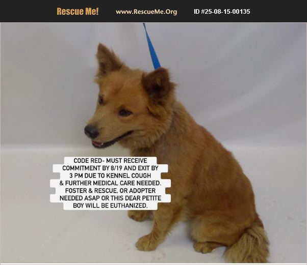 Courtesy Posting: EMERGENCY!!! PUMPKIN GOT A 1 DAY EXTENSION - MUST NOW RECEIVE COMMITMENT BY 8/20 AND EXIT BY 3 PM DUE TO KENNEL COUGH & FURTHER MEDICAL CARE NEEDED!! FOSTER & RESCUE OR ADOPTER NEEDED ASAP TO SAVE THIS CUTIE'S LIFE!! HELP!! -------- CODE RED- MUST RECEIVE COMMITMENT BY 8/19 and exit by 3 pm due to kennel cough and further medical care needed. Foster and rescue, or adopter needed asap or this dear petite boy will be euthanized. URGENT AT DOWNEY, CA- SEAACA KILL SHELTER-ID 26-01256 STUNNING 35 LB SPITZ BREED X 'PUMPKIN' LISTED AS CHOW X, may BE PART JINDO OR ANOTHER SPITZ BREED. FOUND AS A STRAY, NOW ON THE EUTH LIST - NEEDS LOVING, RESPONSIBLE HOME, OR FOSTER AND RESCUE ASAP Please help us find a loving, forever home (or foster and rescue) for this handsome, petite boy who is estimated to be 3- 5 years young and weighs only 35 lbs. We are calling him 'Pumpkin'. Sadly, his owner never showed, and the shelter has sent out a plea for help as he is now ill with kennel cough and nasal discharge, and has been placed on meds. We are unclear if he is Rescue only for medical, or can be adopted with a medical waiver. If rescue only, we can refer potential adopters to a rescue group to help to foster to adopt that way. Please note however he has been added to the euth list with a 8/19 at 3 pm deadline to exit, 2 pm to commit. The shelter has already stated no extensions will be granted. The shelter notes also state, he was 'able to handle and pet, skittish around other dogs, per finder was acting aggressive to other people and dogs while loose, on advanced treatment for kennel cough, cloudy nasal discharge, needs further medical care.' we are unclear when he was started on medicine, but the notice went out 8/12. For direct adoption inquiries and adoption holds, please contact the shelter asap using his listing link: https://www.seaaca.org/adoptions/view-our-animals... or by calling (562) 803-3301 and providing the his ID. If Pumpkin is not already neutered, this will be done for an adopter once he is healthy. However, as Pumpkin likely needs rescue, and rescue groups need fosters and a place for a dog to go; please ALSO contact [email protected] or Southern California Chow Chow Rescue Network asap who is trying to assist with his placement, particularly if you are interested in fostering or fostering to adopt- so we can try to pair you with a willing rescue to help with medical etc. Rescues should call (562) 803-3301 x258 and email [email protected] We will post video, additional pictures and any updates on the Facebook post as we receive them here: https://www.facebook.com/debbie.alder.14/posts/10167611862938125