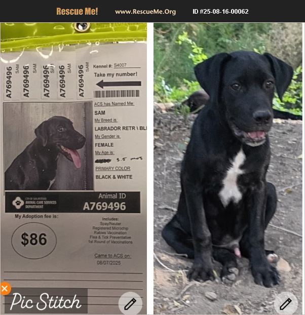Sam is 5 months old, was found dumped w siblings in San Antonio, animal control got them , they euthanize!!! her siblings all got pulled to rescue and she IS LEFT BEHIND!! HELP ME HELP HER , she is beautiful and great w other dogs, cats and kids