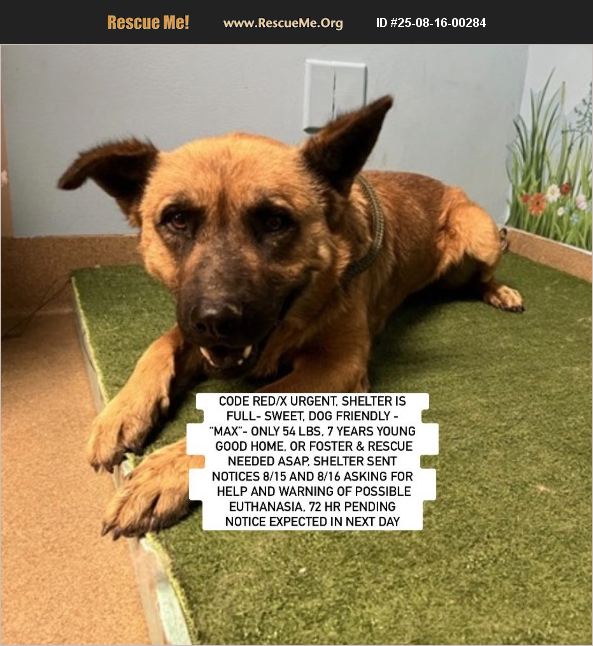 Courtesy Posting: PALMDALE, CA (S CAL)- LOS ANGELES COUNTY ANIMAL CARE & CONTROL- ID #A5719090 'MAX'- only 54 lbs, 7 years young. CODE RED/X URGENT, SHELTER IS FULL- SWEET, DOG FRIENDLY - GOOD HOME, OR FOSTER AND RESCUE NEEDED ASAP, SHELTER SENT NOTICES 8/15 AND 8/16 ASKING FOR HELP AND WARNING OF Possible EUTHANASIA, 72 hr pending notice expected in next day. Please help us find a loving home, or foster and or rescue asap for this sweet smaller german shepherd chow mix named Max dumped at the Palmdale shelter. His owners said they had too many dogs and were 'over the limit'. The shelter understands Max is approximately 7 years old and weighs only 54 lbs, so he is perfect size. The shelter has Max now kenneled with a much larger, male german shepherd- and gave us video of the dogs doing well together. We were told this other dog, Wally, came in as a stray and now a (new Friend) for Max. We understand Wally also needs an exit plan sooner rather than later, but is not as urgent as Max, at least not yet. Both dogs need out, and we have a separate post for Wally who is 110 lbs. His ID is #A5716281. A bit more information on Max: He was fearful on exam, rolling onto his back. However, his ears remained neutral, he has a soft eye gaze and lips. They noted he was quiet. Max is approved for public adoption with calm dogs, low energy. For direct adoption inquiries for either dog, please contact the shelter asap by calling (661) 575-2888 and asking for him/them by ID. All dogs will be neutered for an adopter, if not already done. Max's listing link to check status is: https://animalcare.lacounty.gov/dacc-details/?animalId=A5719090 Wally's listing link to check status is: https://animalcare.lacounty.gov/dacc-details/?animalId=A5716281 However, please ALSO contact [email protected] or Southern California Chow Chow Rescue Network who is trying to assist the shelter with his placement, particularly if you are interested in fostering or fostering to adopt- so we can try to pair you with a rescue to help. Most rescues do need a foster to save a dog. Rescue groups may email the shelter at [email protected] and [email protected] . Videos, additional pictures and updates will be posted on facebook at: https://www.facebook.com/783968124/posts/10167620294353125/?mibextid=wwXIfr Note: to view contents of links you will need to copy and paste each one separately into your browser.