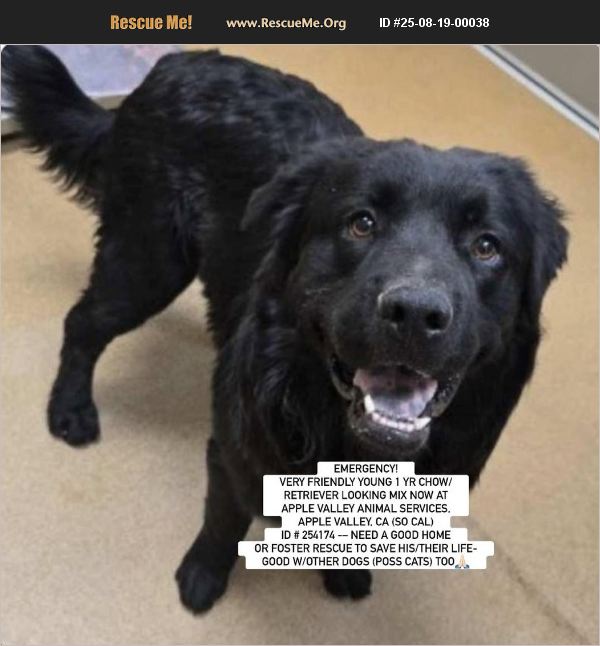Courtesy Posting: EMERGENCY! VERY FRIENDLY YOUNG 1 yr CHOW/RETRIEVER LOOKING MIX NOW AT APPLE VALLEY ANIMAL SERVICES, Apple Valley, CA (So Cal) - ID #254174 -- NEED A GOOD HOME OR FOSTER AND RESCUE TO SAVE HIS/THEIR LIFE- GOOD W/OTHER DOGS (POSS CATS) TOO. Pls contact the shelter to adopt. Came in with what seems to be a sibling of similar size and temperament. Can be adopted, fostered and saved together or separately. We are in urgent need of finding either a good home or a foster and rescue for these two dear dogs. We understand their owner was looking for homes a few weeks back and said they were good with dogs, cats and love people. Originally there were three, but two ended up as abandoned strays at the one of the highest kill shelters in the state. They come available to adopt on 8/19 and are available for rescue pull or euthanasia the very next day on 8/20, per the shelter listing! Their real names are Milo and Otis but we are unclear which one is which as they look very similar. The shelter lists them by ID. 254174- he is listed as 1yr old, weighs 58 pounds and was vaccinated 8/13 around the time he came in. 254175- he is listed as 1yr old, weighs 62 pounds and was vaccinated 8/13 around the time he came in. The shelter describes both dogs as 'Very friendly, energetic, needs behavioral training, walks on leash Dogs will be neutered for an adopter, but do not have long and may need rescue. Therefore, if you may be interested in fostering, fostering to adopt, or helping in some other way (ie., pledging for his/their rescue), please contact: [email protected] or Southern California Chow Chow Rescue Network who is trying to find placement asap, and we can try to pair fosters or interested parties with a willing rescue group. Interested adopter(s) should email an adoption application to [email protected] or call 760-240-7555 for adopters. Any current rescue partners or rescues interested in partnering with the shelter are encouraged to contact us at: [email protected] or call t (760) 240-7000 ext. 7519 to coordinate rescue pull and transportation. Always note the ID. Listing links 254174: https://www.adoptapet.com/pet/45555316-apple-valley-california-labrador-retriever-mix 254175: https://www.adoptapet.com/pet/45555317-apple-valley-california-labrador-retriever-mix Please note this shelter may unlist a dog who is still alive and in need, in anticipation of being killed the next day or later that day. We will post any new information or further pictures or video on his/their facebook post is/are: 254174: https://www.facebook.com/debbie.alder.14/posts/pfbid026tTegTyHXK99ojS7NsUKvWvzhkvh8S4hXzuLTD6mvXDJBoHi3VZHpqqkF9gGyiQwl 254175: https://www.facebook.com/debbie.alder.14/posts/pfbid0W9kahecxxeanoyXZthfZNoYRW9N1Ah3ANHaikwo8V8jVtqdgLJbh7q5j1tYAd4Rrl Both dogs: https://www.facebook.com/permalink.php?story_fbid=pfbid02WT7f6eiy8wwMThrG84mnmRJiiEu2NSfZmBxUqyRLCcN7WMF3ukPZ9XSFckHRRxwrl&id=100064927891266 Note: to view contents of links you will need to copy and paste them separately into your browser.