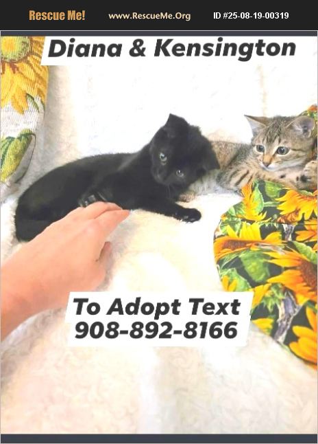Urgent! Save Diana and Kensington! These tiny orphaned rescue kittens are now urgently in need of a home. They are bonded Brother & Sister and would Love to find a home where they could Stay Together!! Diana is female, and Kensington is male. They are spayed/neutered, vaccinated and Ready to Go Home with you TODAY!! To Adopt please Text Message 908-892-8166