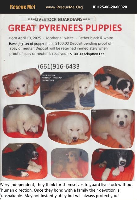 Rescued female Great Pyrenees off streets in Lake LA in the Antelope Valley and shortly after On April 10, 2025 she gave birth to 8 adorable puppies who are now looking for their forever homes! There are (3) white females, (1) white male, (2) black and white males, (1) grey qnd white male and (1) black and white female. Also requesting $100.00 refundable deposit upon proof of spay or neuter.
