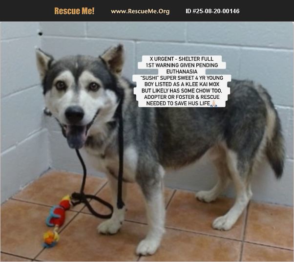 Courtesy Posting: X URGENT- DOWNEY SHELTER (LA COUNTY) in S CAL- 'Sushi' ID #A5717784 Super sweet boy listed as a Klee Kai mox but likely has some chow too, given the blackish tongue. He is estimated to be only 4 years young and weighs only 44 lbs. so he is perfectly sized. Found as a stray, the shelter fondly named him 'Sushi'. They are asking for help as of 8/19, giving their first warning of pending euthanasia due to being overfull. Please read the wonderful things they have to say about Sushi, and help us find placement before he is euthanized for space! Adopter or foster and rescue needed asap!!! ��%BD��%BD%90%BE Meet Sushi - A Sweet, Wiggly Lovebug Ready to Be Yours! ��%BD��%BD%90 ��%BD��%BD%8D��%BD��%BD��%BDͻ The shelter said, 'Sushi is the total package - friendly, relaxed, and full of tail wags! ��%BD��%BD%90%BE��%BD��%BD��%BD��%BD He greets people with a soft gaze, a wiggly body, and a happy, panting smile ��%BD��%BD��%BD��%BD��%BD��%BD%90 . Quiet and easy to handle, Sushi is low-stress and just wants to be close to someone who will love him as much as he loves them. He's the kind of dog who makes every day brighter with his calm, joyful spirit!' APPROVED FOR PUBLIC ADOPTION Here is his listing link: https://animalcare.lacounty.gov/dacc-details/?animalId=A5717784 QUESTIONS CAN BE ANSWERED 24/7 AT (562) 940-6898 IF YOU HAVE PLACEMENT: PLEASE EMAIL DOWNEY ANIMAL CARE CENTER STAFF @DACC Downey Rescue [email protected] LISTING LINK IN THE COMMENTS SECTION OF THIS POST. However, if you can foster or need further help, please contact [email protected] asap who will try to pair you with a rescue and or obtain further info. We can get you a copy of the full medical and behavior notes too. We will be posting updates, and any additional pictures and video as we receive such on Facebook: https://m.facebook.com/story.php?story_fbid=10167634564698125&id=783968124&mibextid=wwXIfr Note: to view contents of links you will need to copy and paste each one separately into your browser.