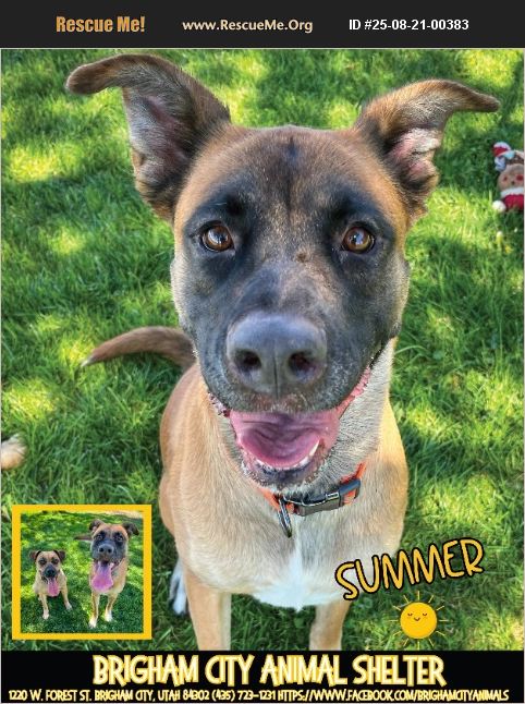 Summer's details: Name: Summer Age: 4 years Breed: Boxer/German Shepherd Mix Personality: Confident, outgoing, adventurous Training: Mostly house-trained Other Dogs: Good with her sister, Autumn (joining playgroups soon) Cats: Unknown Fixed: $190 (Adoption fee includes spay voucher) Vaccinations: Current Ideal Home: Active family, secure yard. Backstory Summer and Autumn came to the shelter together after their owner could no longer care for them due to health issues. Having spent most of their lives as outdoor dogs, they are still discovering the comforts of indoor living. Summer is the more confident one, while Autumn is more reserved and leans on her sister for reassurance. Together, they balance each other beautifully and would love nothing more than to continue their journey side by side in a safe, loving home. Brigham City Animal Shelter 1220 W Forest St, Brigham City, UT 84302 Phone: (435) 723-1231 Hours: Tuesday-Friday, 12-6 pm Facebook: https://www.facebook.com/brighamcityanimals *Disclaimer: This post was created by a shelter volunteer. For more details, please contact the Brigham City Animal Shelter directly. Your support is greatly appreciated!