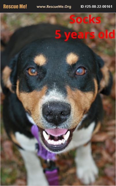 Socks is a 5 year old that appears to be a Greater Swiss Mountain Dog/ Dobie mix girl that was rescued from a hoarding situation and is just learning what it truly means to be a dog. Socks is such a sweetheart and eats up praise. She is smart and has learned basic commands at the rescue. She was one of many that was heartworm positive when rescued but has been treated and is ready to start her new life! She has been spayed, vaccinated, dewormed, and is heartworm negative now! Her adoption fee is $250.