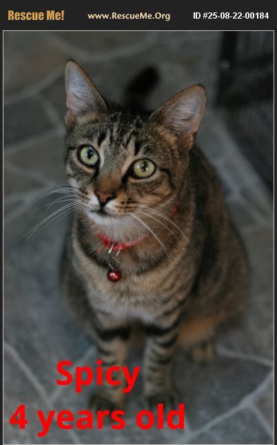 Spicy (really a sweety) is a beautiful 4 year old tabby girl with lots of confidence! She is good with other animals and kids and uses the litterbox. Spicy loves napping on her human and playing with the other animals. Spicy also likes to be apart of the action and gets into everything! She has been spayed, vaccinated, dewormed and is FIV/ FeLV negative. Application and adoption Fee of $125 required. Apply at roseacresrescue.org.