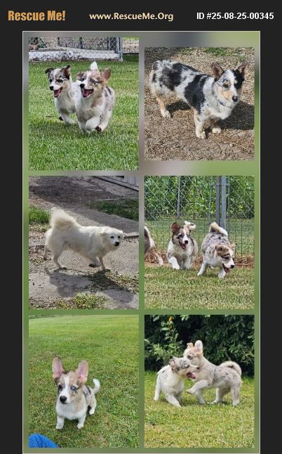 Update 9/2/25 we have 2 merle boys still available for adoption...... We received a call about these 4 puppies needing placed in rescue to find homes. When we arrived to pick them up we did as if we could take a picture of the parents of the puppies while we were loading them. They both were their 'farm dogs' as we were told. But of course both were unaltered. Daddy is the merle corgi and mom is the little white Spitz. The pictures of the puppies were taken at our adoption center once we arrived back with them and got them settled in. This was their freedom play time after being in a dark and dirty barn. They loved the big grass yard and they ran, rolled and played until all tuckered out. The babies are happy, healthy and very sweet. They have had a some vaccinations and dewormings already but will see our vet of course for current vetting and wellness exams. They have a birth date of 5/22/25. They will be going home on a spay/neuter contract with a 75.00 rebate to help towards their spay/neuter when they are age appropriate (6 months). If you are interested in adopting please text or email us to request an application. We were not able to rescue either of the parents to the puppies as the owners would not release them to us. Yes we did try to bring them in to rescue as well. Unfortunately we could not make this happen:(.