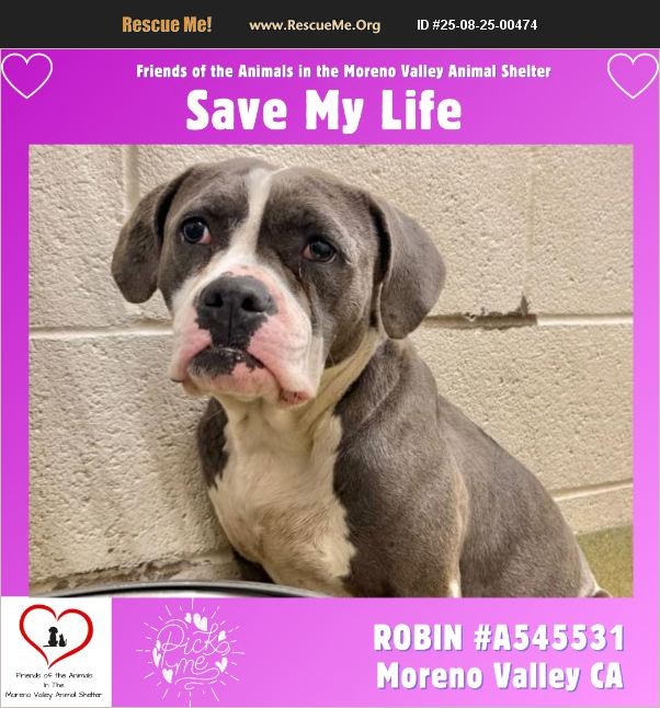 ID#A545531 I am described as a female, gray and white Pit Bull Terrier mix. The shelter thinks I am about 2 years. I weigh approximately 35.00 lbs. I have been at the shelter since Aug 19, 2025 and I may be available for adoption on Aug 26, 2025 at 12:21PM.