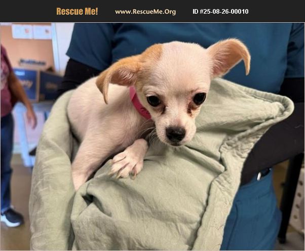 ID#A545575 I am described as a female, white and tan Chihuahua - Smooth Coated mix. The shelter thinks I am about 6 months old I weigh approximately 3.16 lbs. I have been at the shelter since Aug 21, 2025 and I may be available for adoption on Aug 28, 2025 at 10:02AM.