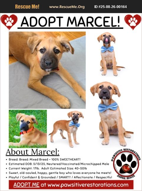 ��ժ Marcel - TOO CUTE TO BE SINGLE!��ժ Four months old. Silky-soft fawn coat. Soulful eyes. A dashing blue bow tie. Marcel has it all - except a family. This playful, affectionate, smart boy loves kids, toys of every kind, and running around the yard before crashing for a cuddle and belly rub. He's crate trained, learning his potty skills like a champ, and will do anything for a 'good job' and a couple treats. Marcel is adventurous, goofy, and full of love. He's ready to be the heart of your home - could you be the one to scoop up this sweet, silly, soulful pup? *** Go to www.pawsitiverestorations.com to learn all about our dogs, watch their silly videos, read our adoption process, and to submit an adoption application. Inquiries made on this site will not be seen! Visiting our website will answer all of your questions. Thank you! ��%90 ��%90%BE