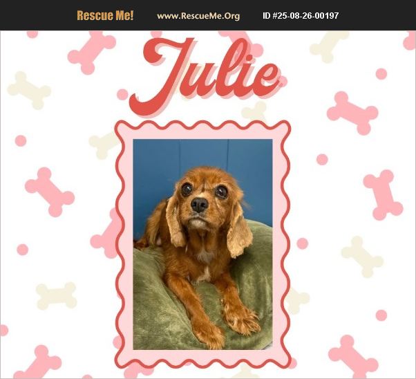 �Ϭ Meet Julie �Ϭ Julie is a gorgeous 6 yr old Cavalier who weighs just 15 lbs-small in size but big in sweetness! ��ե She's gentle, loving, and gets along wonderfully with other dogs. While we haven't had her around children yet, her calm nature suggests she'd likely fit into just about any household. Julie is spayed, up to date on vaccines, and ready to meet her forever family. ��%8F� If you've been dreaming of a loyal little companion to shower with love, Julie might be the perfect match. ��ҩ Apply today