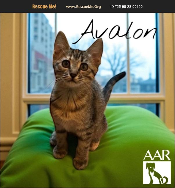 Avalon is a snuggly, soft, gentle kitten with a loud purr. She's a little shy but quickly warms up to her person then meows for attention and loves to be carried around. In foster care she was okay with the family's own cats and quiet dog.