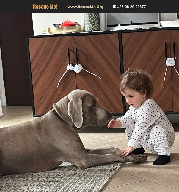 SENIOR 8 Year old established purebred male! Get your adoption application to us asap! www.socalweimrescue.org/pages/adopt WINSTON is a loveable happy healthy cuddly senior who is on the bad side of the having toddlers in the house. He has kind of suffered being put on the back burner with so much activity with toddlers keeping mom overly busy. He does really well with the kids and most other dogs (prefers the ladies) but isn't getting the exercise he once knew and loved. The family yearns for Winston to be number one in a family again and hopes for him to be able to get out more and do walks, hikes, runs and simply just be able to spend more time with his people. We will know much more about him soon but you can't get much more perfect than this boy. Who wants 'puppy stage' when you can have an older dog come in and just melt into the routine? He is reliably house trained and knows his commands. Want to meet him? We have dozens more photos if you just ask! Don't miss out on meeting this precious boy! Letter from previous owner who loved him dearly: Dear Caretaker, It is with a heavy heart that we give our companion of 8 years away to live in another home. We trust you will get to know him and love him as we have. I swore I would never be one of those people who have children and forsake their beloved dog, but here I am, doing exactly that. We came to this decision as a family- because it is painful to watch our boy not living the life he deserves. Since having two little ones under 2 years old, we are spread so thin. We have very little time, energy, even affection left for him. When truly all he wants is to be near his human, get pets and cuddles and lots and lots of treats. But instead he gets a lot of kennel time and shushing (and bark collar). I know he just wants things to go back to the way they were before kids- with him being the center of our universe. He's used to daily exercise, now it's become 2-3 times weekly. He's used to free rein in the house, he's now allowed only in the kennel or outside. He's used to fresh air and beach and mountain trips, but now he's stuck confined in a backyard- to be fair- so are we. But he doesn't understand that and I know it upsets him. The rare times we have time for him he just blooms with happiness and I see hints of the dog we used to spoil and cherish. lt truly is not fair to keep him if that means he will be unhappy. We are very sad that we are no longer able to give him the life he deserves, but so happy you are able and willing to do this. I know he will be the sweetest, most loyal dog to you and your family. He has been to us. This letter is sounding more like an airing of my guilt rather than a proper introduction to our wonderful big guy. I want to write to you about Winston! He is smart as a whip and very intuitive and empathic. When I say that, I mean he can feel your feelings. He will come put his head on your knees, sleep next to you cuddled, sniff and lick your face. He is radiantly happy when you return, even to the point of whine/crying from joy. He really is so very sweet and happy. He gets along well with most dogs- after an initial 'who's who' barking and introductions they tend to play very well together. We used to live near a bike path for most of Winston's life with us- so he was exposed to hundreds of different personality/temperament and sized dogs. We had daily play dates and met new friends constantly. As an intact male- he was very gentle and playful with 90% of dogs- but we did have to keep him away from a few who seemed to be aggressive together. He has also been very tolerant and gentle with our kiddos. Mostly avoids them- but when they get the urge to pull his tail, smack him or do other undesirable things he seemed to be chill and just took the abuse. We obviously wouldn't let it continue for his sake but he's never reacted to this. His intelligence shows in different ways, also. He is very curious about most things- animals, new items, places, etc. Oddly as a water dog- he won't swim in lakes/pools. But doesn't mind getting wet. He loves running in the surf at the beach. He loves mental stimulation, frozen treats in chunks of ice, put peanut butter in bowl, treats in the Kong toys, treats in a blanket rolled up. lt seems to me that he gets more tired from figuring out mental puzzles like these than from physical activity.