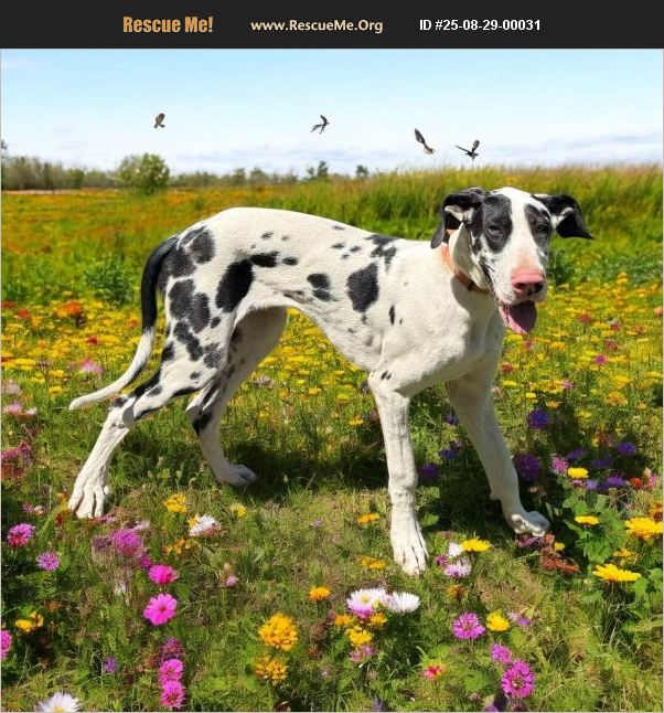 A Dane Ready to Waddle Right into Your Heart! Meet Waddles, a handsome Harlequin Great Dane puppy who has a big, loving heart and is ready to dive right into the arms of his forever family. Although his name is Waddles, he soars when it comes to affection. He loves being with his people and wants nothing more than basking in the warmth of your attention, while nesting close by your side. His wagging tail creates gentle ripples of joy, inviting endless scratches and cuddles. He's also perfectly polite with dogs of all sizes, cool with cats, and unbothered by livestock - flocking happily around them. With a curious nature, Waddles is ready to explore the world and paddle through adventures big and small. If you're looking for a companion who'll bring lots of love, a splash of laughter, and just the right amount of quackery into your life, Waddles is ready to create waves of happiness that will last a lifetime. Please spread the word to help Waddles find his forever family! Share this post, tag your friends, and let's make sure he finds a family that will give him a wonderful home and all the love he deserves. White Kisses requires all dogs to be in training within thirty days of adoption. Training is crucial for dogs to learn lifelong skills and to understand their place in the family pack. It is also essential part of getting to know each other and to help your pup become a well-mannered GREAT Dane! For more information about White Kisses adoption process and an application please visit www.whitekissesgreatdanerescue.com/adopt