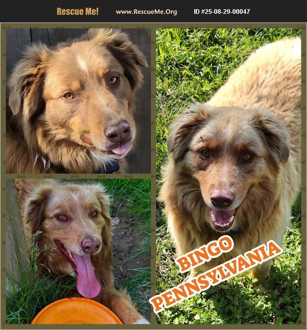 Meet Bingo, a seven year old red tri Aussie who finds himself in need of a new home through no fault of his own. Bingo is neutered and up to date on vaccinations. He is not in the ARPH program; we are screening homes for the owner. Bingo is a friendly boy that loves fetching, either balls or Frisbees, and will bring them back. The evaluator referred to him as 'a very nice dog'. Bingo would be best with a female canine companion rather than a male, and no cats. He was raised with children who are now ages 9 and 10, but he might be a bit too exuberant for younger ones. He's a sturdy 65 pounds, so restricted food intake and an exercise plan would be in order. He rides well in a crate in a car and is well-behaved at the vet's. Bingo has not lived inside so is not housetrained. But it shouldn't take much to do that; adult dogs normally housetrain much faster and easier because they are physically capable of holding it. He walks well on leash and knows sit but would benefit from further training. He's very smart and willing to learn. This sweet boy has a lot of potential and would love to be your new best friend. He will be very devoted to his person. If he checks all the boxes on your bingo card and you'd like to be the winner of Bingo's unconditional love, please submit an application for adoption at www.aussierescue.org Bingo is located in western PA.