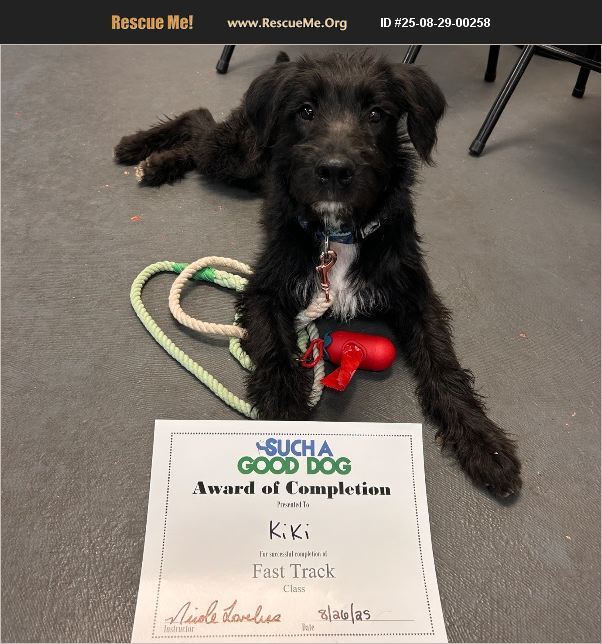 We got Kiki from a 'rescue' - she was underweight and had the worst ear infections my vet had ever seen. Kiki has graduated from her training class successfully. She knows sit, down, stay, leave it, drop it, and come. She has very good recall with all of them, but should still practice reinforcement. She walks very well on leash and is great off leash. She will not be one to run off. Although she still struggles with her separation anxiety, she has made small steps. With medication and a snuggle puppy she can get some rest in her crate alone. She sleeps through the night with absolutely no issue. She's never destructive when left, but she has trouble settling. Her potty training has been successful, and at 6 months she can hold it the appropriate amount of time for her age. Health wise she's finally gaining weight and has cleared her ear and eye infections. We also opted to reboost her vaccinations, since the rescue was so neglectful in her health in other areas. We think she's finally ready to go to forever home. So if you know anyone looking for a shadow, Kiki is your girl.