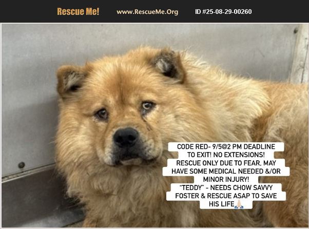 Courtesy Posting: CODE RED- 9/5@2 pm deadline to exit! No extensions! RESCUE ONLY DUE TO FEAR, MAY HAVE SOME MEDICAL NEEDED AND OR MINOR INJURY! 'TEDDY' AT SAN BERNARDINO CITY SHELTER - NEEDS CHOW SAVVY FOSTER AND RESCUE ASAP TO SAVE HIS LIFE- ID #A584286 - San Bernardino City Shelter, in S Cal Help! The SBC shelter is full, and is sadly now dealing with a distemper outbreak so dogs get very little time. Young Teddy was found as a stray and fearful as many chows are in a shelter environment, and was therefore placed on the euthanasia list already. We are in desperate need to find a chow savvy foster and rescue to exit him prior to the given deadline. He is estimated to be only 3 years old and is stunning and we were given several videos we will post on Facebook. You can see he is just scared, and also has a lot of goop in his right eye, possibly an infection. The shelter told us, 'This guy is extremely fearful and has exhibited fear-based aggressive behavior while here. Due to this, he is not considered adoptable, but he can be pulled by a rescue organization. He is still being assessed for a possible injury; however, the reporting animal control did not provide details. He needs to be assessed by our RVT team to determine if he actually is injured and to what extend. However, he appears to be stable in kennel and does not have any severe visually apparent injuries. Given his reactivity and need for rescue placement, it has been determined that he be placed on an urgent deadline for 9/5/25 at 2PM.' Additionally, please note this shelter unfortunately has a distemper outbreak and insufficient tests, so they recommend testing any dog, and we recommend keeping any dog coming out of this shelter separate from other dogs until more is known. 'Rescue only' means only a rescue group can pull him out of the shelter (he cannot be adopted directly from the shelter, you need to go through a rescue group) to save him. However, rescues need fosters and a place for a dog to go. Therefore, if you are interested to foster or foster to adopt him, please contact [email protected] asap or Southern California Chow Chow Rescue Network who is trying to assist the shelter with his placement. His shelter listing link is: https://24petconnect.com/SanBernardinoCityShelterPets/Details/SBCT/A584286 Please notes rescue groups typically need a foster to save a dog. We will to pair you with a willing rescue group in time. Rescues should contact San Bernardino City Animal Control at (909) 384-1304 and also by email [email protected] asap and note his ID. We will also post additional pictures, video and updates on facebook at: https://www.facebook.com/debbie.alder.14/posts/pfbid02NTk2WnhXyknkukSHcfD3FweSF842SeHjweMhm7sEAdBisqXj3x4tV2gE6sHxBz3xl Note: to view contents of links you will need to copy and paste each one separately into your browser.
