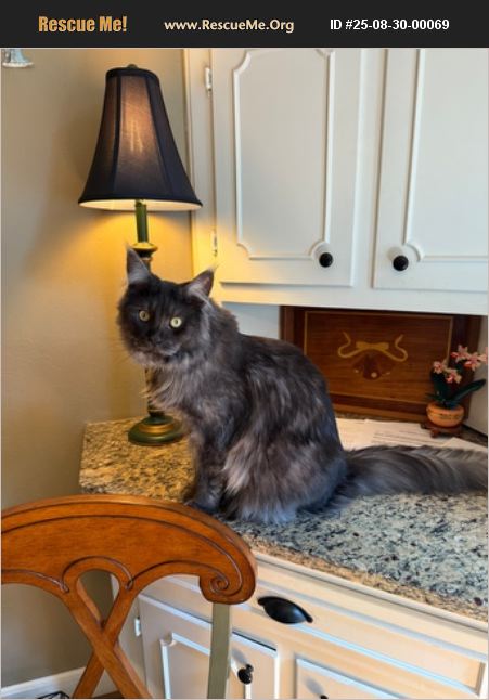 Majestic purebred Maine Coon cat. Beautiful example of breed with great muzzle, ear tips and dramatic tail. Black/gray smoke coat color. He is not registered, but is from TICA registered & health tested parents. Likes to play, explore, investigate and climb--and cuddle! The cat enthusiast's cat. More pictures available on request. Price negotiable for the right home.