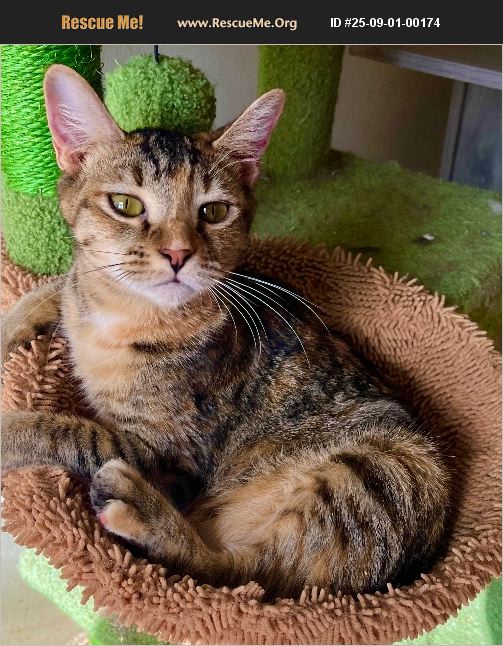 This gorgeous kitty girl is Chessie as in the Chessie cat mascot of the old Chesapeake and Ohio Railroad. A beautiful Calico Tabby known either as a Caliby or Tabico, Chessie has stunning spots and swirls similar to those of Bengal Cat. Her super soft cost is an amalgam of tans, blacks, and light and dark oranges. Chessie became one of my rescue wards on Sunday, January 19, 2025. At the time she was a teeny tiny kitten, skin and bones in desperate need of rescue. Her finder reached out to me requesting assistance. Upon entering her apartment in Gilpin Court, I spied Chessie peering out of a small cardboard box. As I readied myself to leave having placed Chessie in a kitten carrier, the individual stated that she had a second kitten the same size as Chessie. Her young son then entered the room in which I was standing dangling a small black kitten by its back I legs. I departed not only with Chessie, but also with the black kitten, who I named Peake. While I do not know if they were from the same litter they became and remain great buddies. Chessie is a super gregarious, playful girl who also enjoys cuddling. She is long and lithe, quite graceful and resembles a miniature Cheetah in looks and her movements. A strong personality, Chessie can be bossy/pushy at times especially at meal time, but does verywell with my personal and rescue kitties. She is quite smitten with all my dogs and enjoys interacting with them. Chessie enjoys playing with any type of wand, springs and jingle balls. She has mastered the turbo scratcher and pummels the PawsPik interactive toys. Fuzzy mice stand no chance against this fierce huntresses and she will reward her human by placing her favorite toys, fuzzy mice and springs in their bed overnight as they sleep. Chessie is a bed sleeper and will snuggle beside her human's legs or feet until she become too warm. Chessie is spayed, has combo tested negative for both feline leukemia and feline immunodeficiency virus, has been rabies and distemper vaccinated, microchipped, treated for fleas and dewormed. If interested in becoming this great girl's human, please feel free to contact me. I do when possible like to receive a vet reference for potential adopters.