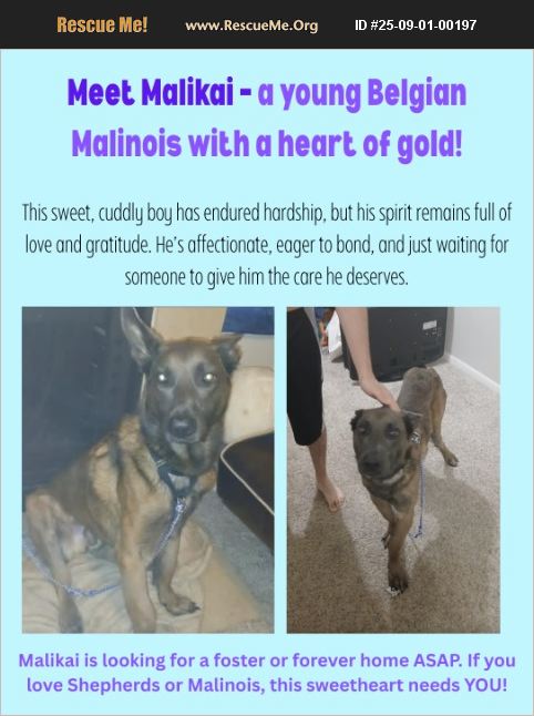 Meet Malikai - a young Belgian Malinois with a heart of gold! This sweet, cuddly boy has endured hardship, but his spirit remains full of love and gratitude. He's affectionate, eager to bond, and just waiting for someone to give him the care he deserves. ��� Neutered and recently vet-checked (healthy!) �%9D� Needs full vaccines at adoption ��%8F%A0 Current housing can't keep him due to health & lease issues ��%90%BE Not yet tested with other dogs, cats, or kids ��s%BD Potty trained Malikai is looking for a foster or forever home ASAP. If you love Shepherds or Malinois, this sweetheart needs YOU! CALL OR TEXT: 281-851-3773