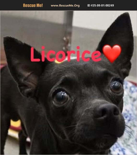 Please help me live! The shelter has given me a deadline I have done nothing wrong so I hope you can commit to FOSTER me before my deadline! Located in Phoenix Arizona Please apply here Call or text 602-834-4911 or submit app Dogfoster.org He is a 2y Black Chihuahua and weighs 8lbs. Poor guy was found in a canal on 8/23. He followed his handler and wanted to jump on his lap. He is interested in people but timid and scared in the shelter. He likes treats. We don't know much about him but we do know that he wants to be loved. Licorice is so terrified in the shelter setting. He is slow to trust but wants love and affection. He needs a patient, loving, safe foster to help him learn he can trust again.