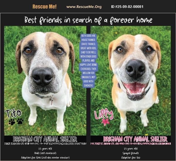 Meet Lilly & Tito! This sweet duo was surrendered together and are now looking for a forever family. Lilly 2.5 years old Spayed female Bulldog mix Adoption fee: $40 Tito 2.5 years old Male (not neutered) Bulldog mix Adoption fee: $190 (includes neuter voucher) About Them Housetrained and crate trained Great with kids Said to do well with other dogs Playful and happy when exercised, then mellow for snuggles Not good with chickens They'd be happiest staying together, but they can also thrive in separate homes. No matter what, both Lilly and Tito will fill your life with love and joy. All adoptions are upon approval of the adoption application only Brigham City Animal Shelter Hours: Tues-Fri 12-6 pm Address: 1220 W Forest St, Brigham City, UT 84302 Phone: (435) 723-1231 Facebook: https://www.facebook.com/brighamcityanimals